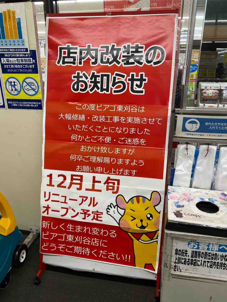 2022年11月11日 ピアゴ東刈谷店、改装中!(刈谷市) 100均に行こうとして、久しぶりに東刈谷のピアゴへ行きましたが…現在大規模改装中なんですね。2階の服屋さん、100均セリアは今やってないです!行かれる方ご注意下さい。たしかに、東刈谷のピアゴってちょっと古い感じでしたもんね。工事の幕の様子を見ると、セリアがおっきくなるのかな?完成が楽しみです!12月上旬にオープンだそうですよ!ちなみに、今週末に食料品うりばでは空弁・駅弁フェアが開催されます!愛知県ランキング にほんブログ村 < 前の記事次の記事 > コメント コメントフォーム 名前 コメント 記事の評価 リセット リセット 顔 星 情報を記憶 コメントを投稿する