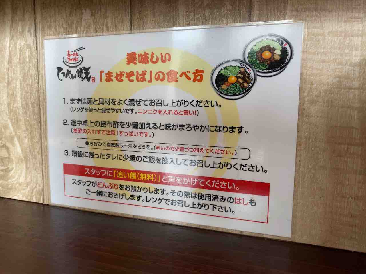 ちなみに、テーブルの食べ方についての張り紙にも書いてありますが、麺を食べ終わった後にサービスで「追い飯」を入れてもらえます。
