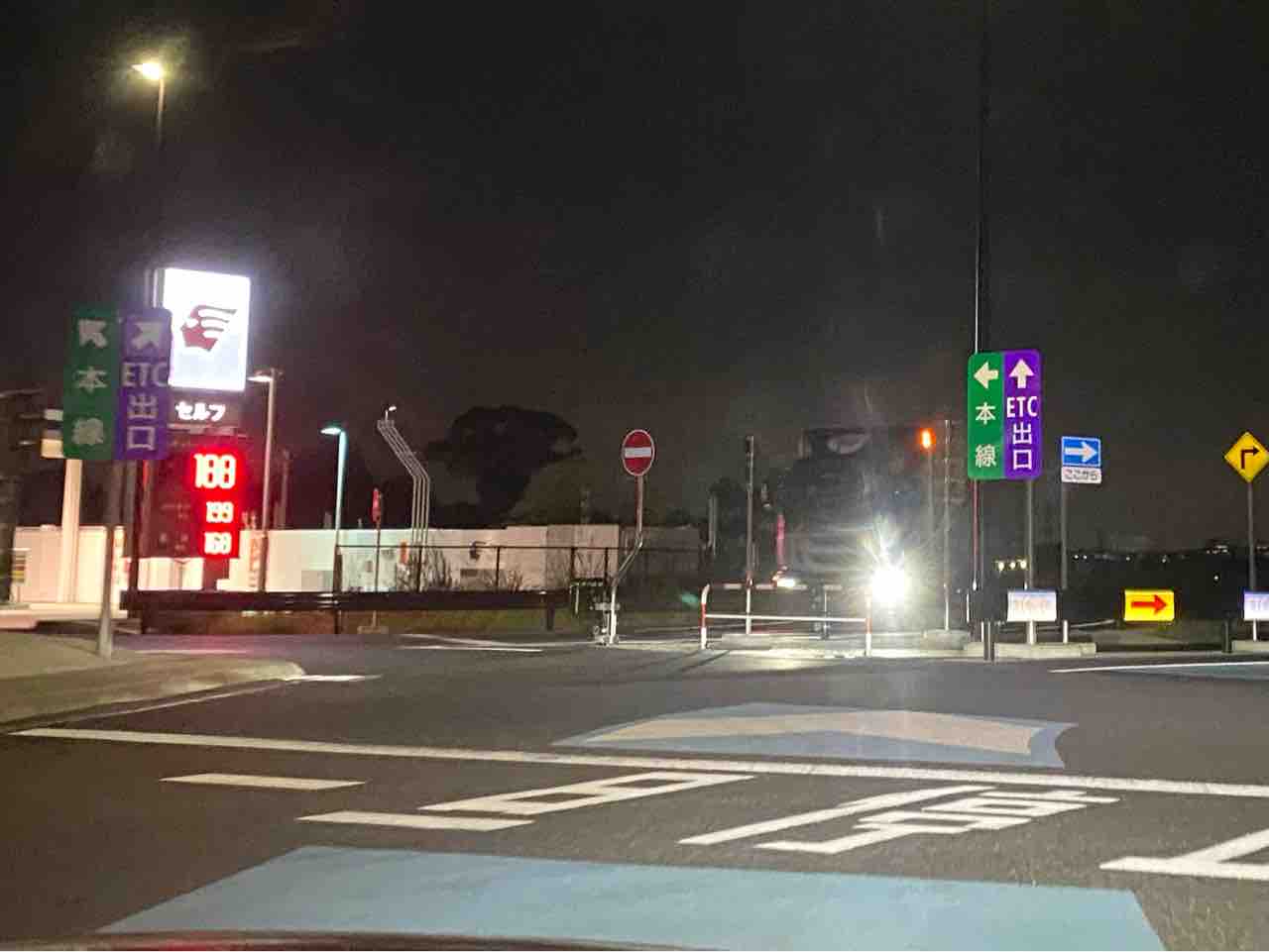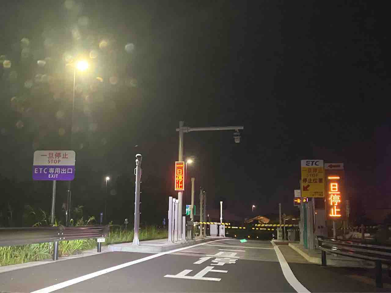 駐車場から高速道路本線の方に向かっていくと、ETC出口の看板と、路面に青い表示があります。
