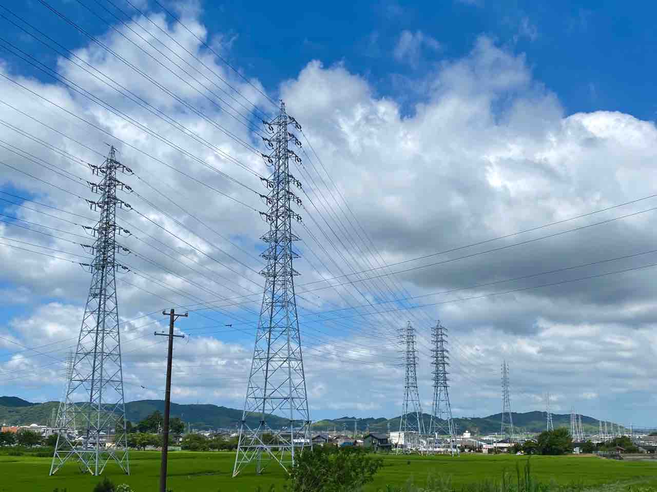 あと、これは道中に見つけた真っ直ぐ並ぶ鉄塔と電線。青空と緑がいい景色!