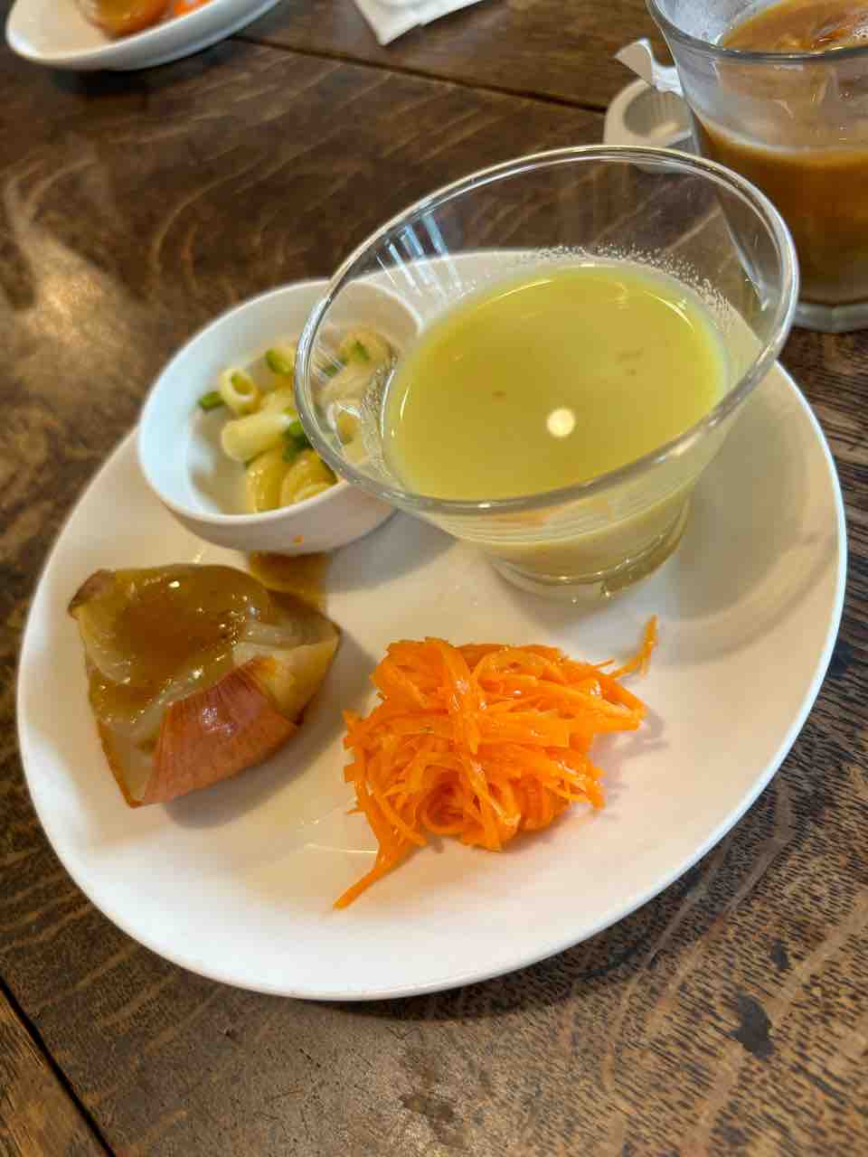 ちょっとした前菜もついてきます。4種類が小皿に乗ってやってきます。左に見える玉ねぎは掴んだら崩れるほどにトロトロ〜!