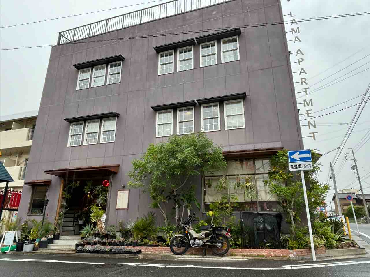 「LAMA APARTMENT」の看板と、表にはたくさんの植物!落ち着いた色の外壁に、白い窓枠で…なんかちょっとオシャレですよね。