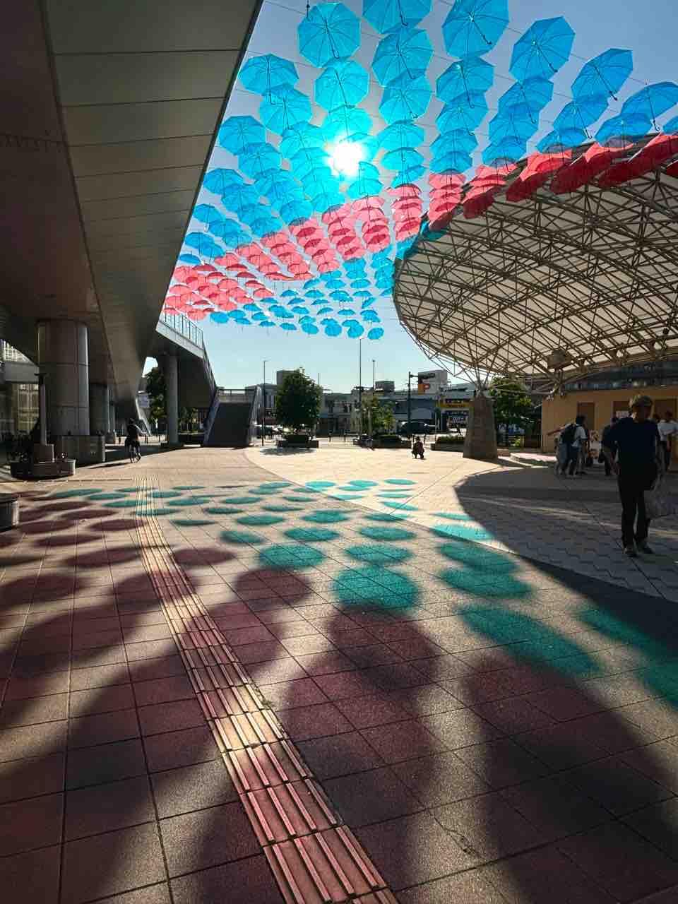 下から見るとこんな感じ。赤と青の傘が風に揺れておしゃれ〜!