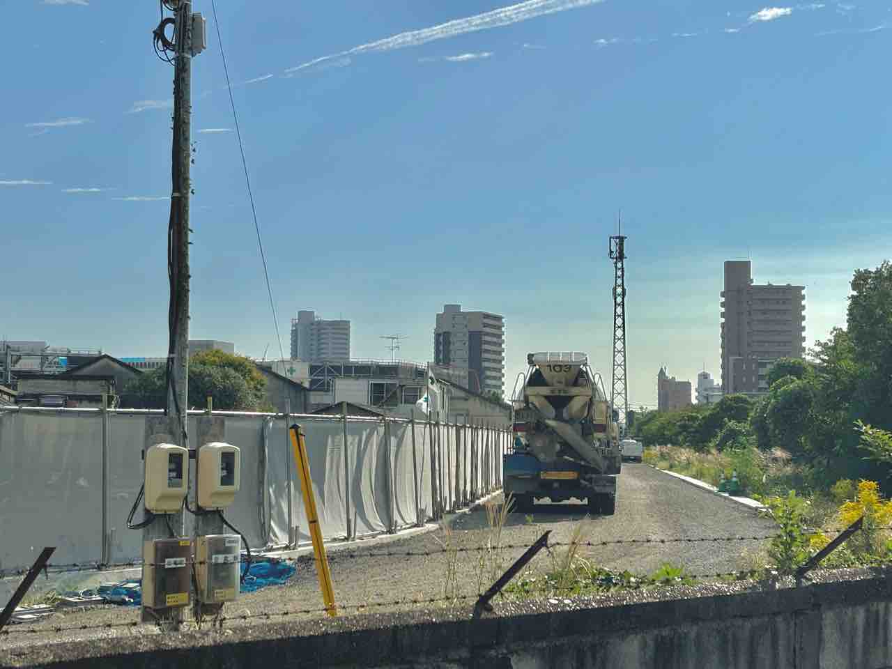 ちょっと分かりにくいですが、店舗裏側・JRの線路に沿って伸びる工事用車両の出入口。篠目踏切(パチンコ屋さんとか、マツキヨから来る斜めの踏切)から撮影です。