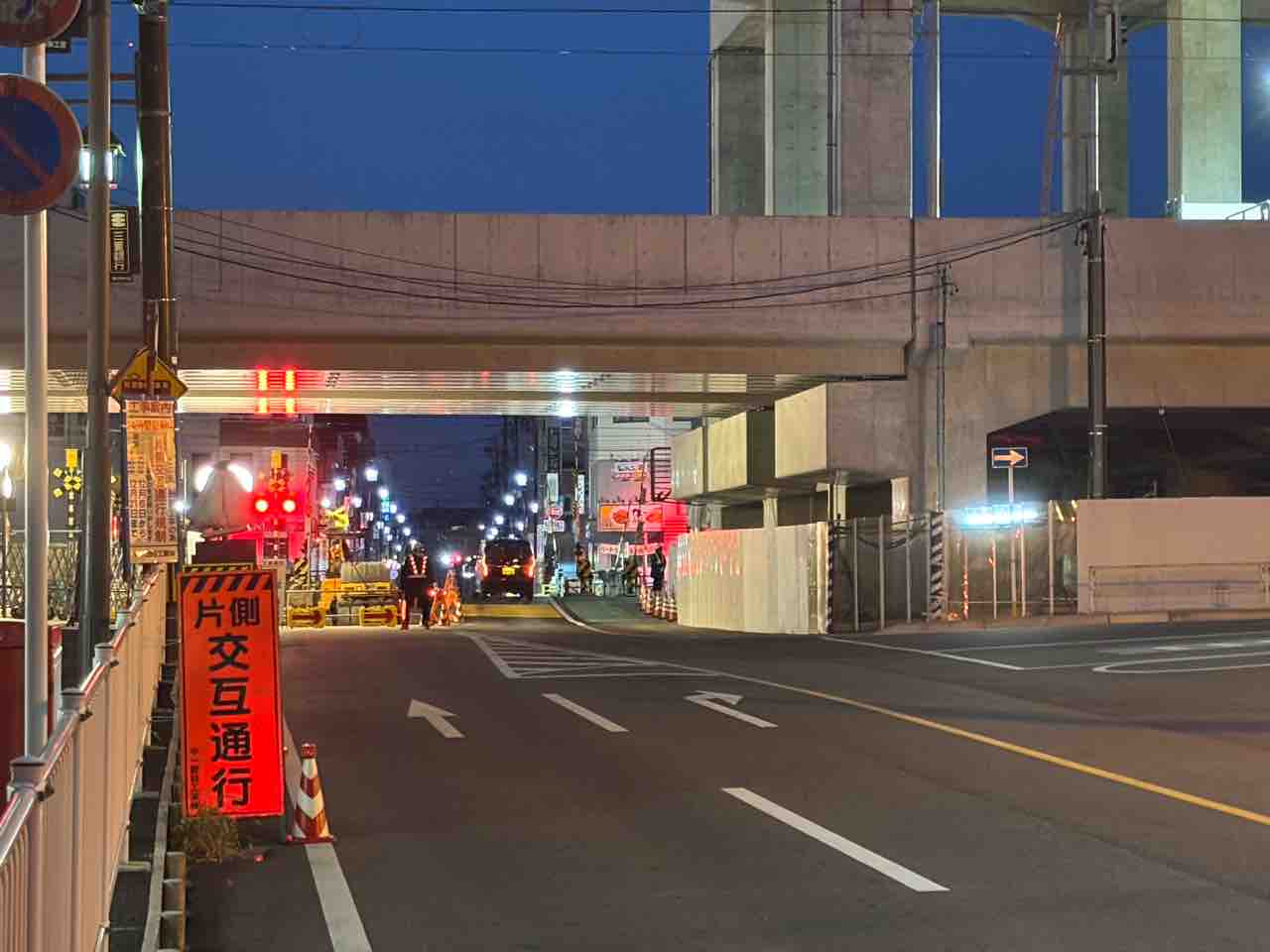 現在地上を走っている、名古屋本線下り、三河線の橋桁を架ける工事の関係みたいですね。駅前の踏切では通行規制も行われていました!
