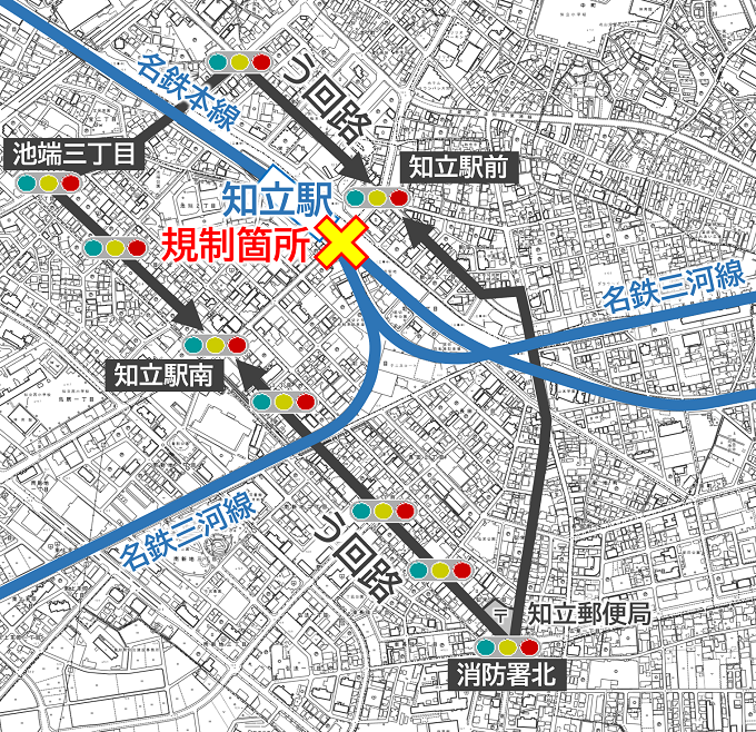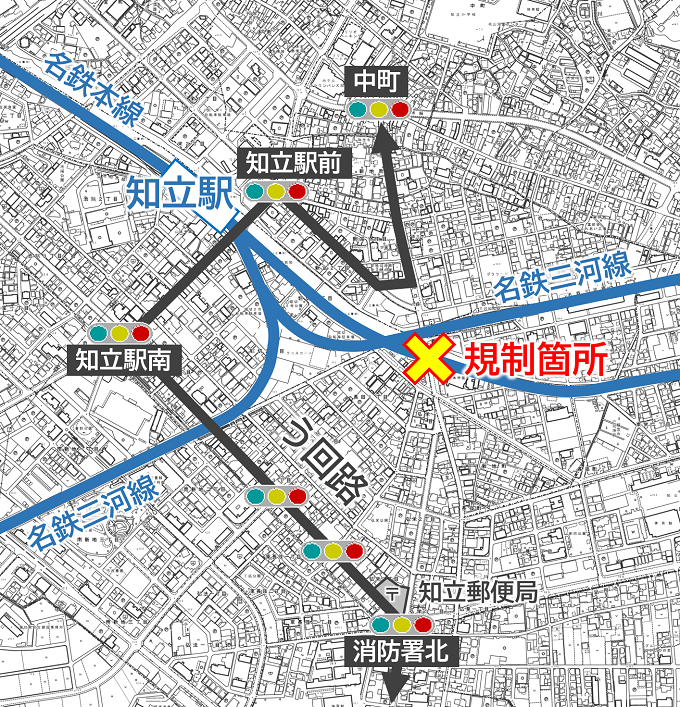 規制が行われるのは、知立郵便局から北の「安城知立線」と、駅前の踏切「本町堀切線」の2箇所みたいです!
