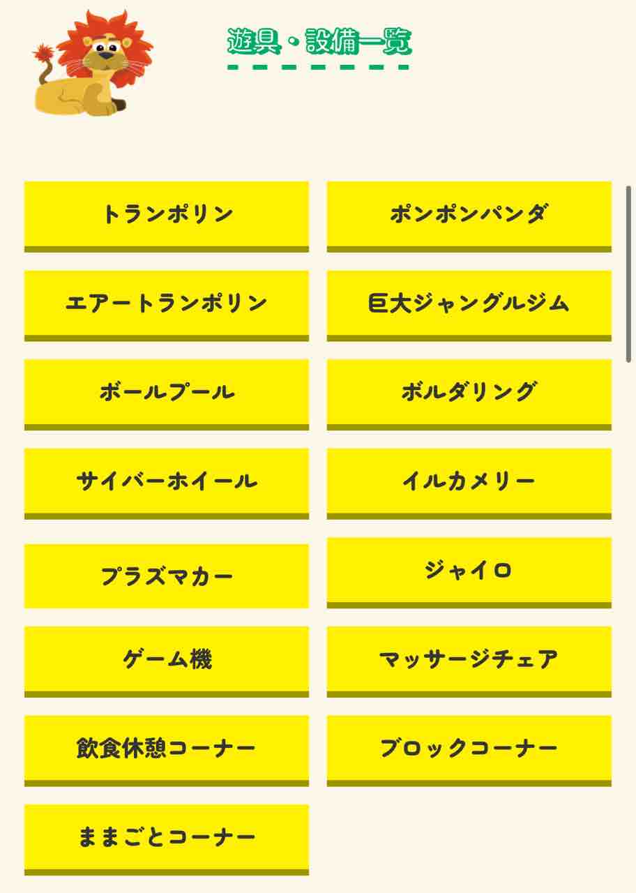 店舗ごとの遊具の一覧もありました。ボールプールやトランポリンなんかは、こういった大型のお店ならではかもしれませんね。なかなかワクワクするラインナップ!