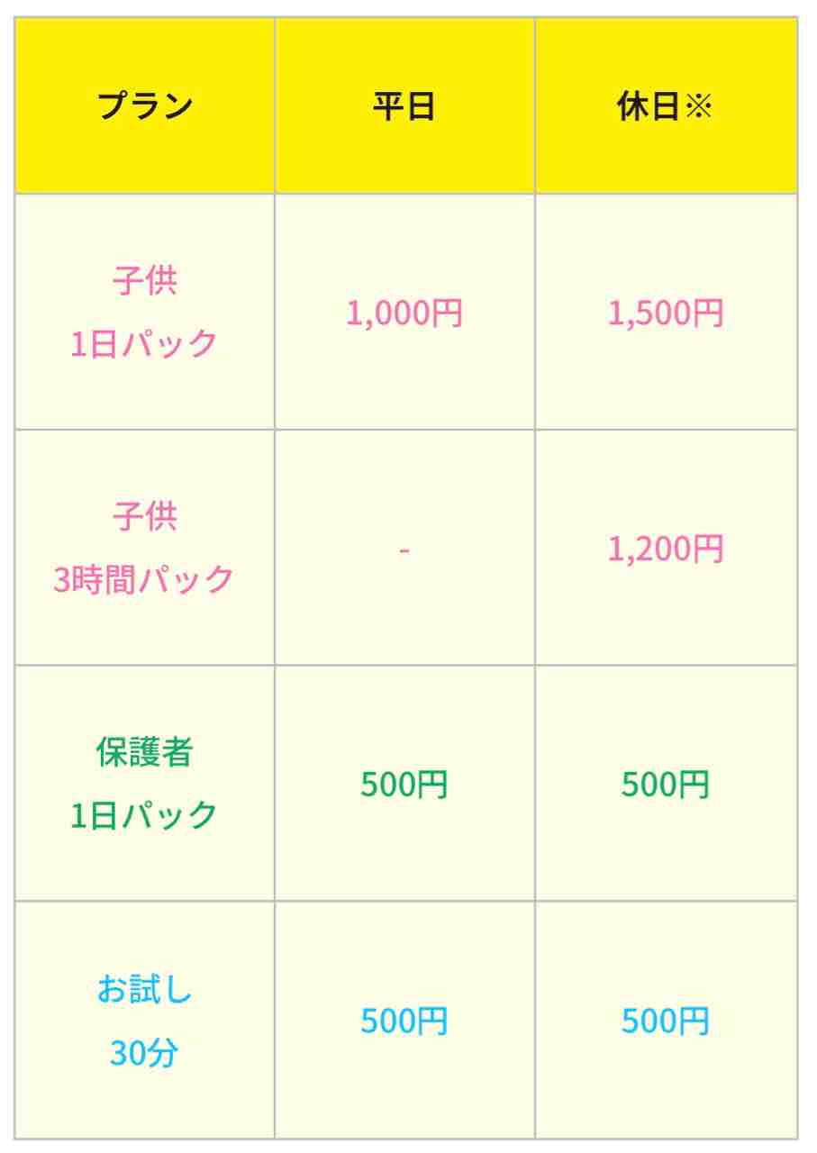 入場料を払って、中の遊具で自由に遊ぶ形式のようですね。ホームページに料金表もあったのでこちらもご紹介!
